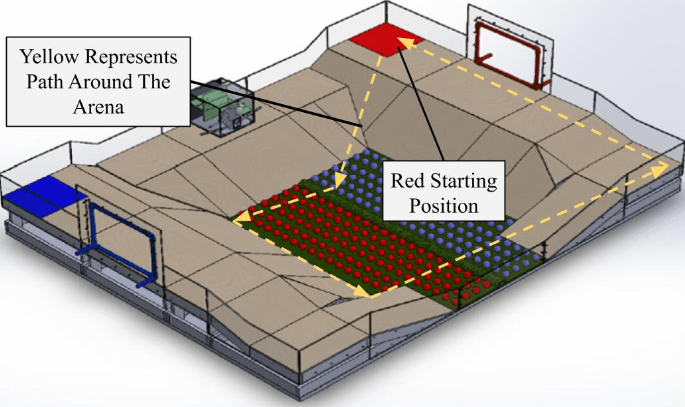 You can also see that the arena has ground of varying slope. Some robots, if designed top heavy or too close to the ground, could only travel over the shallowly sloped ground.