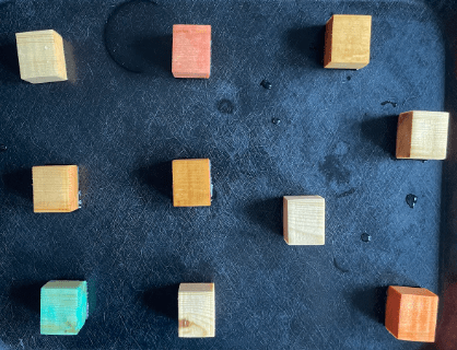 This unit encouraged us to take an experimental approach to something. Very nice and vague, so I decided to see how wooden blocks would be dyed if left in drink liquids for four days. I chose to soak the blocks in water, red wine vinegar, olive oil, iced tea, hot tea, iced coffee, hot coffee, blue powerade, yellow powerade, and orange fanta. The results are shown on the right.