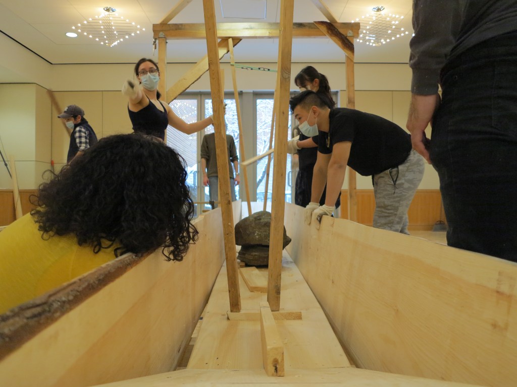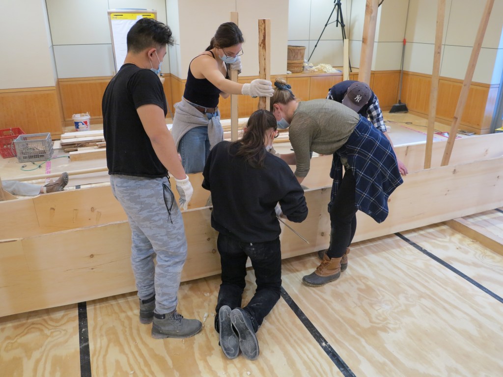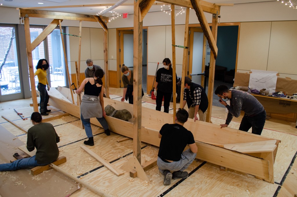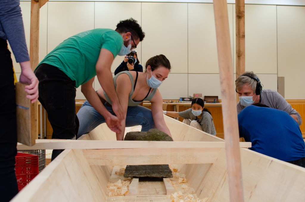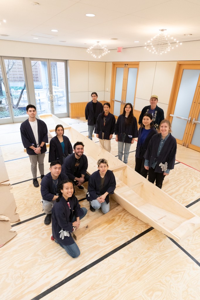 The focus of the workshop was the construction of a 21-foot honryōsen, a working skiff native to Niigata Prefecture’s Shinano River basin. Using traditional tools and techniques taught in an apprenticeship-inspired learning environment, participants gained a deeper insight into the materials, customs, and relationships that shape the art and craft of Japanese wooden boatbuilding today. At the end of the workshop, participants physically moved the honryōsen from the workshop into CGIS’s Friends of Japan Concourse area. There it played a central part in a Reischauer Institute-organized exhibition that ran through the end of March. Titled In the Making: Learning from Japanese Wooden Boatbuilding, the exhibition highlighted the history and culture of Japanese wooden boatbuilding while inviting the audience to explore—from multiple vantage points—the dimensions of embodied learning and discovery inherent to the making process itself.