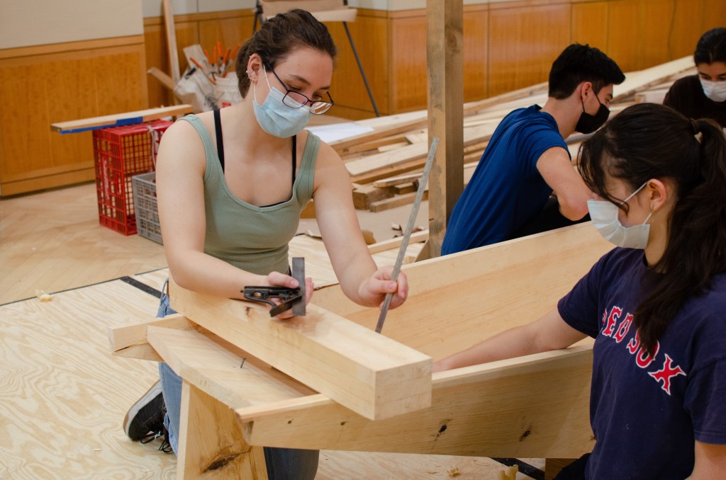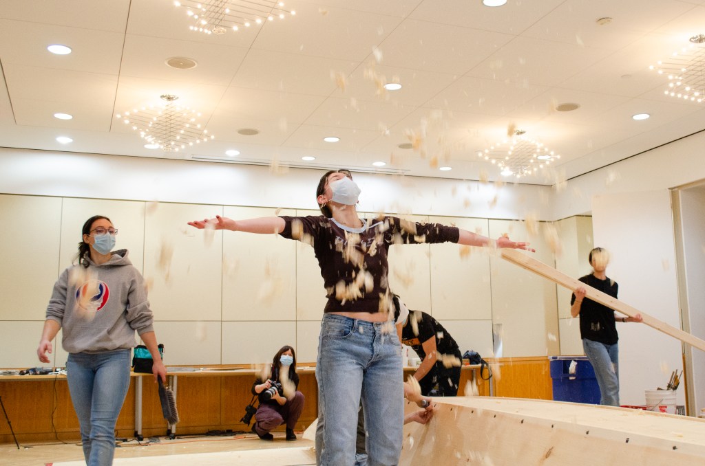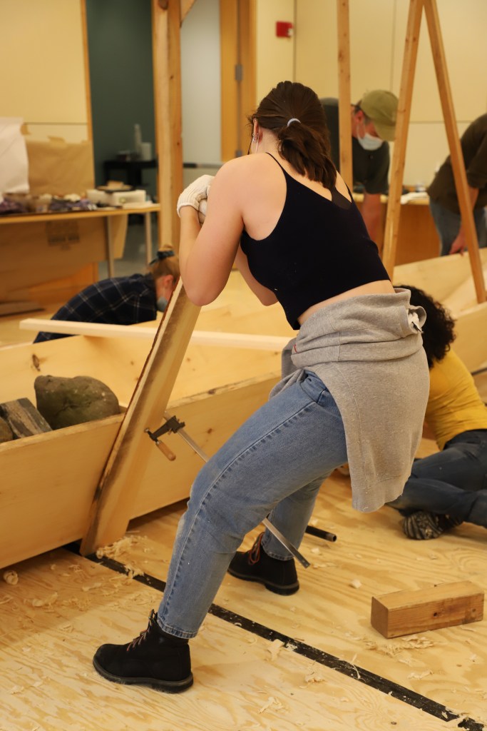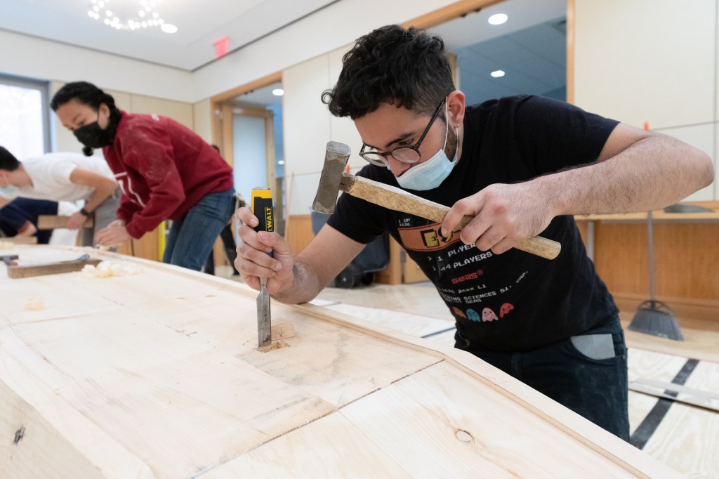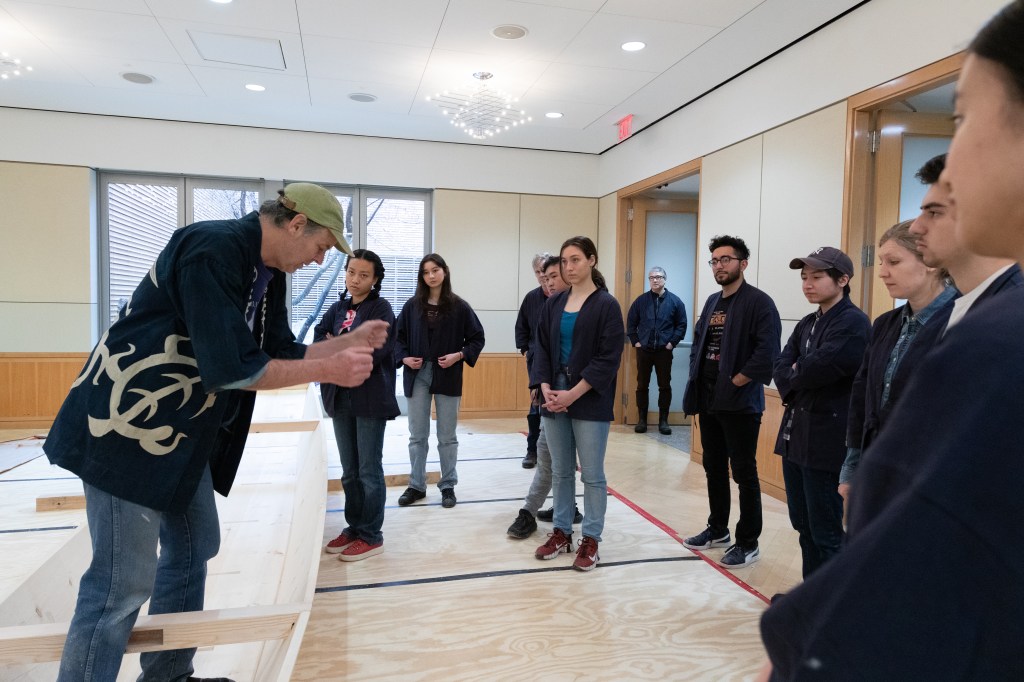 The focus of the workshop was the construction of a 21-foot honryōsen, a working skiff native to Niigata Prefecture’s Shinano River basin. Using traditional tools and techniques taught in an apprenticeship-inspired learning environment, participants gained a deeper insight into the materials, customs, and relationships that shape the art and craft of Japanese wooden boatbuilding today. At the end of the workshop, participants physically moved the honryōsen from the workshop into CGIS’s Friends of Japan Concourse area. There it played a central part in a Reischauer Institute-organized exhibition that ran through the end of March. Titled In the Making: Learning from Japanese Wooden Boatbuilding, the exhibition highlighted the history and culture of Japanese wooden boatbuilding while inviting the audience to explore—from multiple vantage points—the dimensions of embodied learning and discovery inherent to the making process itself.