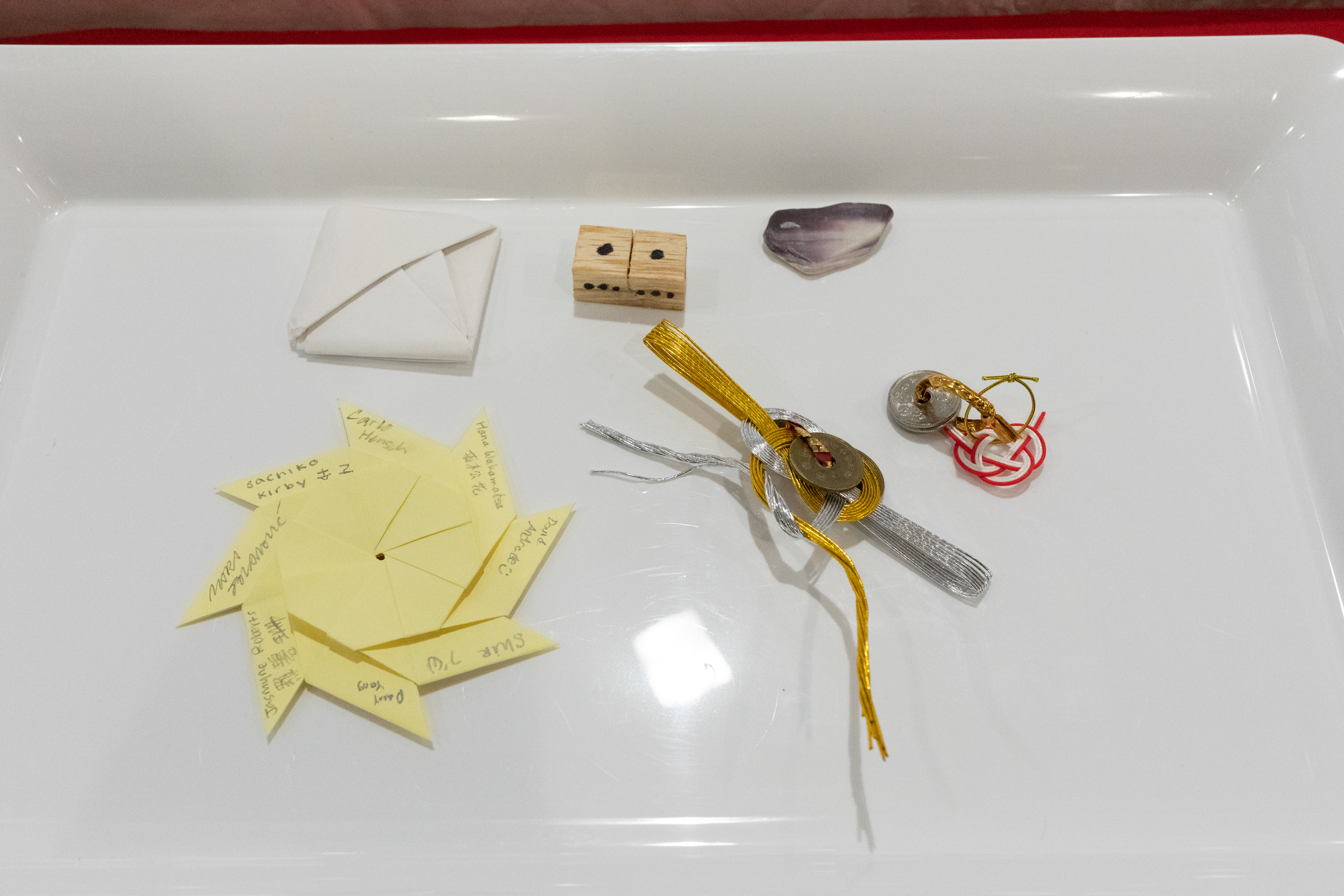 The series of object laid out in the upper right image to the right are objects that were placed in a sealed, watertight compartment in the boat. It will never be opened again, and is a traditional practice in Japanese boatbuilding.