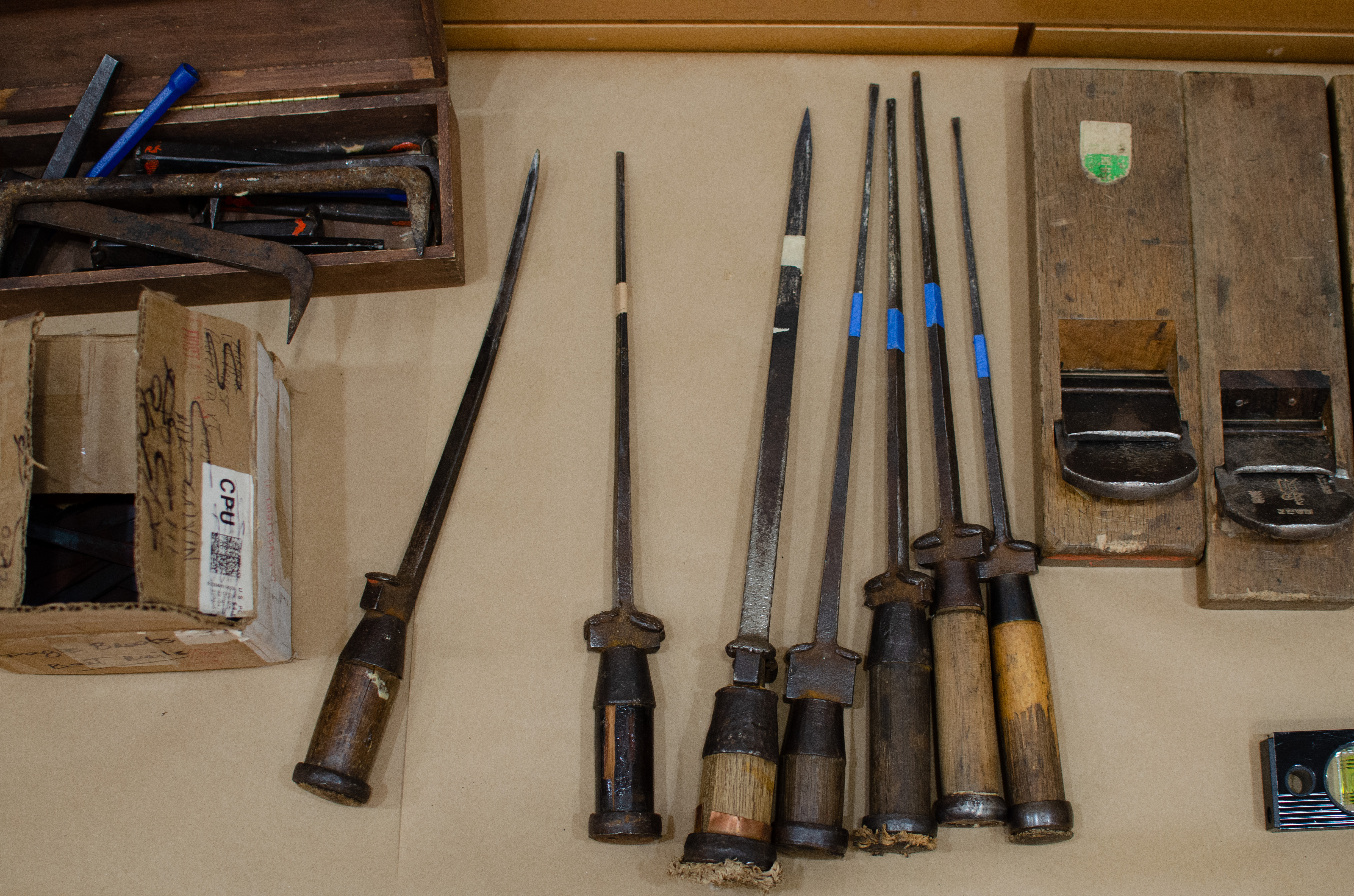 Below are some of the tools we used in constructing the boat. Many of them look and function similar to the Western version of the tools – such as the handsaws, chisels, planars, and hammers – but they have subtle differences. The planars are used by pushing them away from your own body, and they are extremely light compared to western style planars.