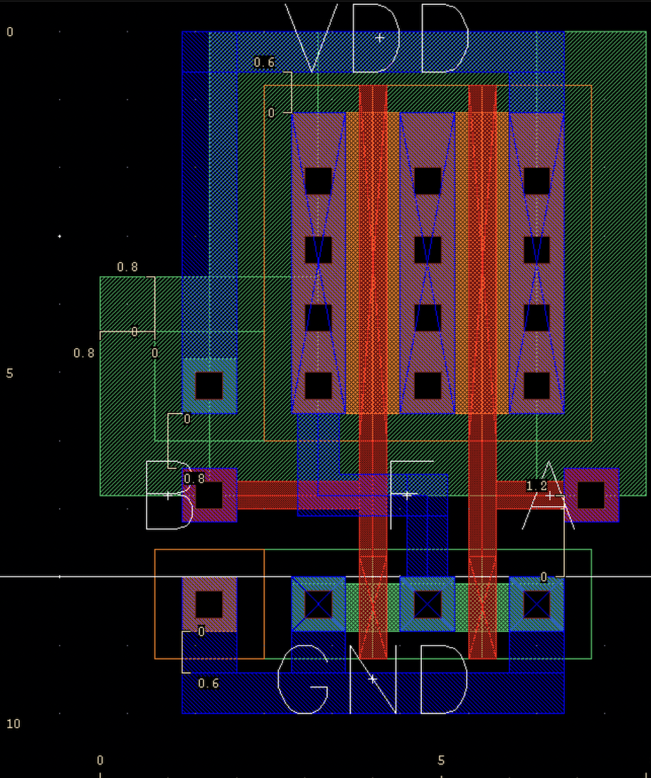 I was not working on microchips themselves, but rather an issue with their display method. Below is a build schematic for a very simple microchip – a NOR gate. Its size is 80 square micrometers.