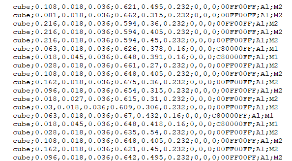 shape of the object; dimensions x, y, z; location x, y, z;rotation around x, y, z;hexidecimal colorcode;material label;layer label